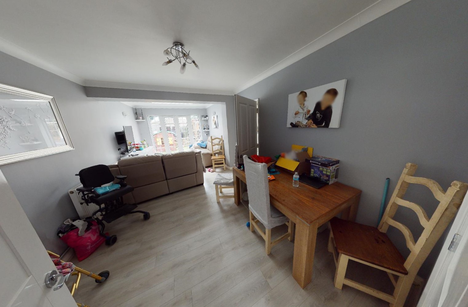 The layout needed an overall revision with view to further extend the house and provide easy wheelchair access, as it had none. The parents’ bedroom was moved downstairs to be close to their girl, allowing her sibling to finally have a decent size bedroom in the loft with proper sized bathroom, not just literally a wc. An open space with ample circulation was created to lodge a new kitchen and lounge area with full width bifold doors and wheelchair ramp, away from the activity room but with clear view to ensure child safety.